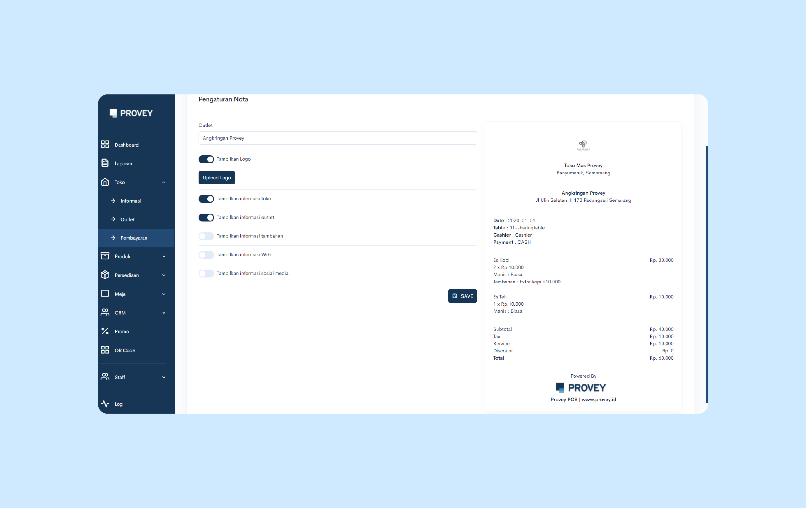Jika ingin membuat tampilan struk lebih menarik, gunakan saja Provey POS dalam bisnismu. Melalui fitur Manajemen Toko di dalam sistem backoffice-nya, pebisnis bisa dengan mudah melakukan kustomisasi pada nota atau struk yang dicetak, mulai dari menampilkan identitas toko hingga informasi tambahan seperti sapaan unik untuk pelanggan. Tertarik menggunakan aplikasi POS ini?